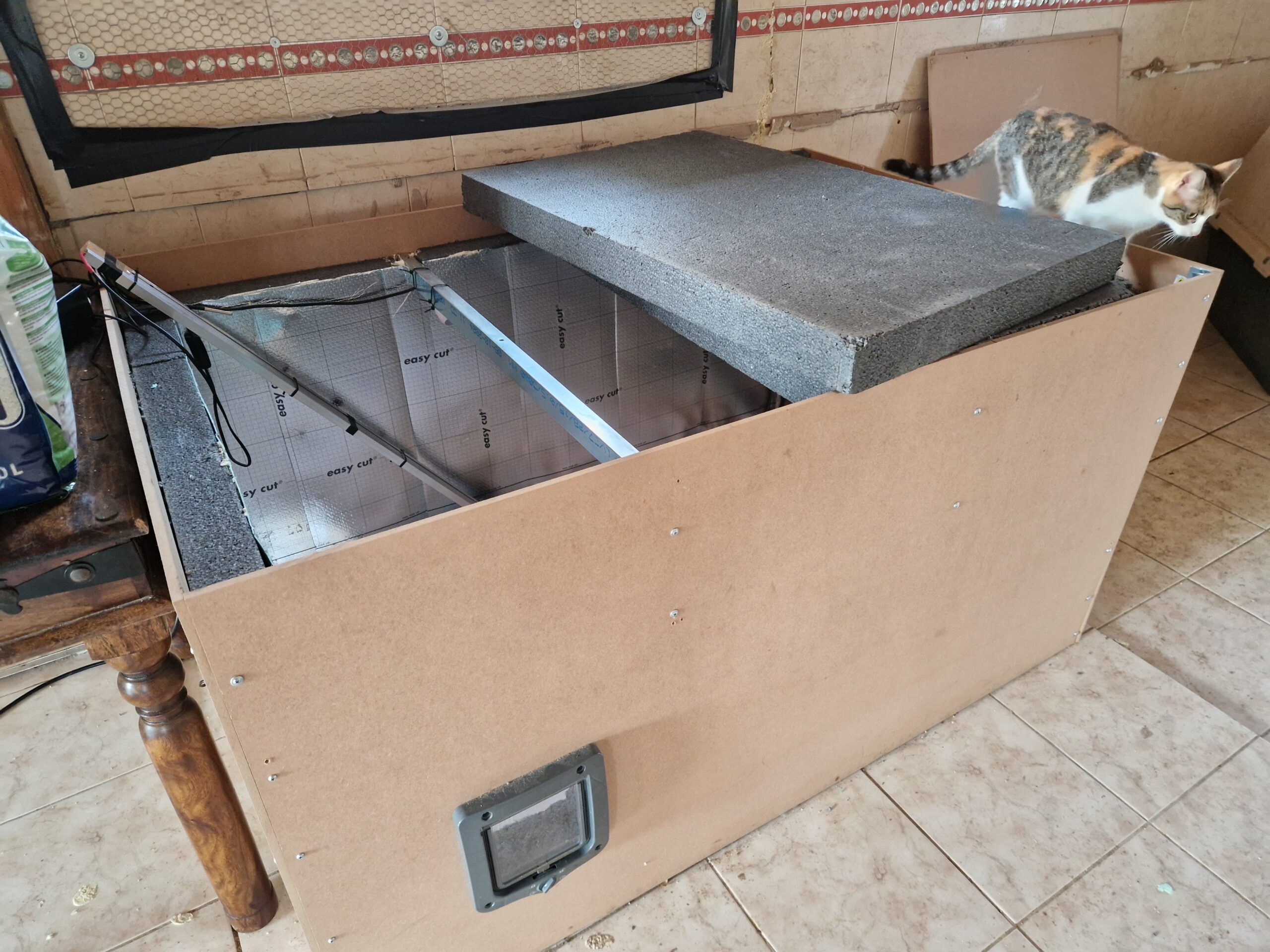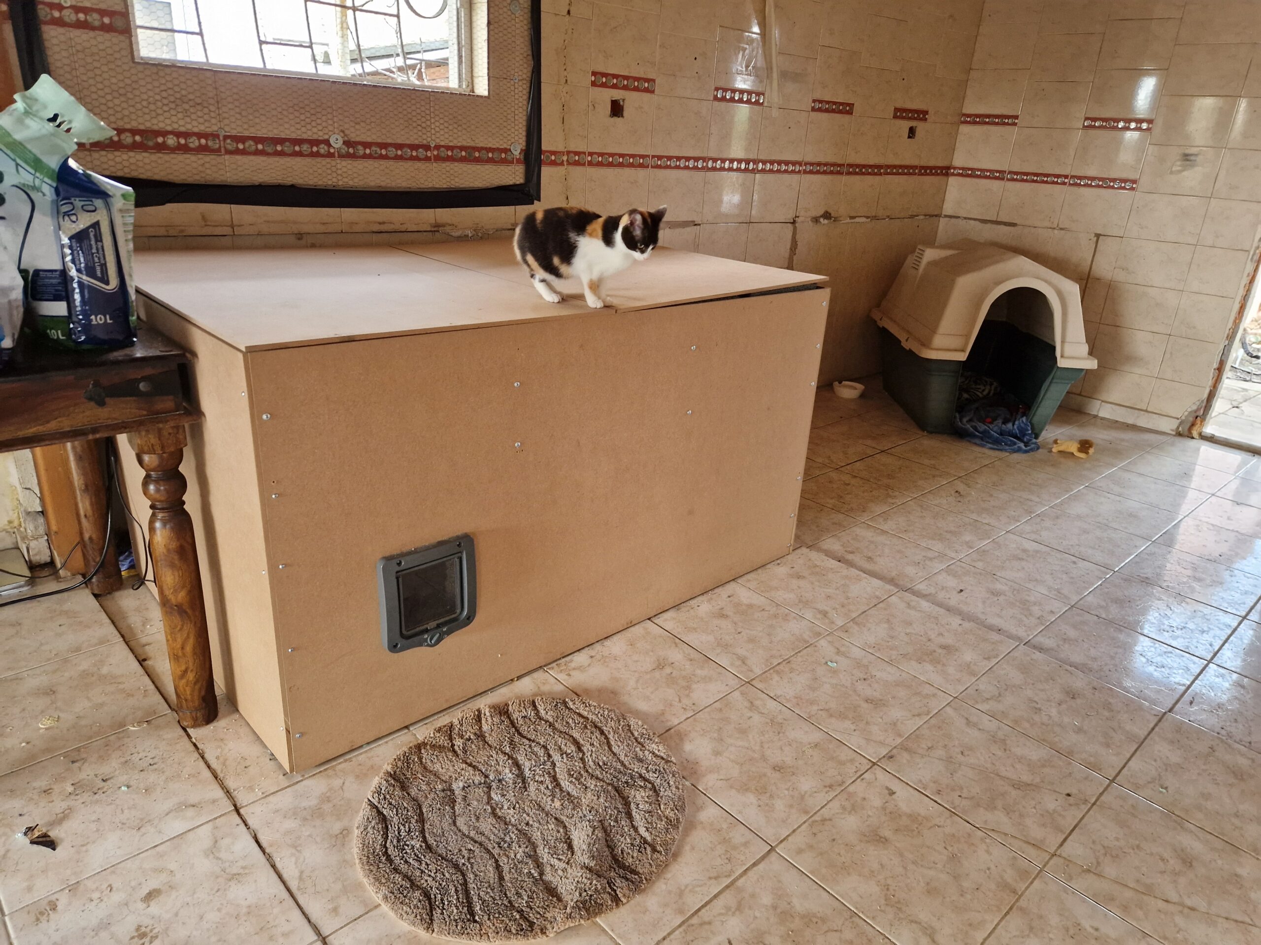 Da das Katzenhaus auch nach der Renovierung nicht isoliert ist und teilweise keine Fenster hat, haben wir eine Lösung geschaffen, die unseren Katzen jederzeit Schutz und Wärme bietet: unsere voll isolierte, beheizte Katzenbox. Die Box ist rundum gedämmt, verfügt über eine Katzenklappe, einen Temperatursensor, der automatisch auf etwa 21 °C reguliert, sowie eine kleine, per App steuerbare Heizung, die jedoch auch autonom zuverlässig arbeitet. So bleibt es im Inneren immer angenehm warm – selbst an kalten griechischen Wintertagen. Die Katzenbox steht innerhalb unseres Katzenhauses und bietet bis zu 10 Katzen gleichzeitig einen geschützten Rückzugsort. Dank ihrer zuverlässigen Wärmeversorgung ist die Box ein wichtiger Bestandteil unseres Katzenhauses und sorgt dafür, dass jede Katze im Winter sicher, warm und entspannt schlafen kann.
